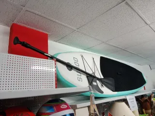 Remo de pádel surf con un diseño moderno y funcional. Perfecto para disfrutar de tus salidas al agua. Segunda mano en buen estado. - Pala de color verde menta. - Eje negro.