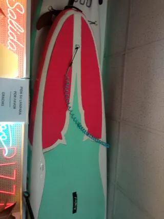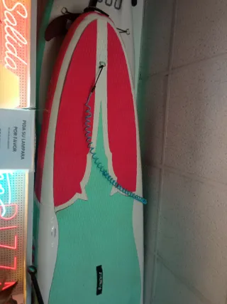 Tabla de pádel surf con un diseño llamativo en colores rojo y verde menta. - Superficie antideslizante. - Cinchuelo de seguridad azul. - Aleta en la parte trasera.