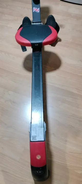 Máquina de remo con diseño deportivo en negro y rojo. - Asiento acolchado. - Reposapiés ajustables. - Bandera Union Jack en la parte superior.