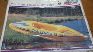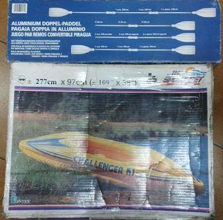 Canoa inchable con varias cámaras de aire. Casi sin uso. Se acompaña de un remo de aluminio multiconfigurable, para hacer un remo doble o dos simples.