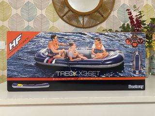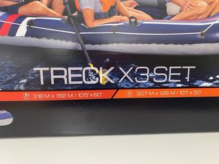 Barca hinchable Bestway TRECK X3-SET sin usar y con caja cerrada. - Dimensiones: 3.18 m x 1.52 m (10'5 x 5'0). - Capacidad: 3 personas. - Carga máxima: 270 kg (594 lbs). - Incluye remos y bomba.