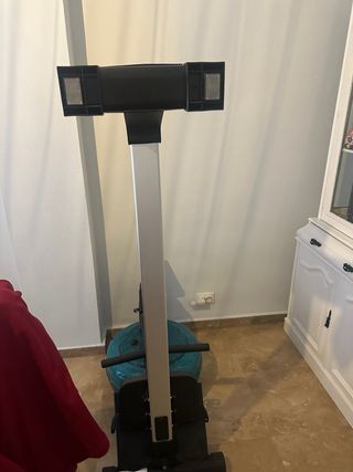 Máquina de remo de la marca ISEFIT, ideal para entrenamientos en casa. Su diseño es moderno y funcional. - Estructura metálica plateada y negra. - Asiento cómodo y ergonómico. - Reposapiés ajustables. - Manillar de agarre firme. El soporte de la pantalla está roto aunque se puede arreglar. La pantalla funciona perfectamente