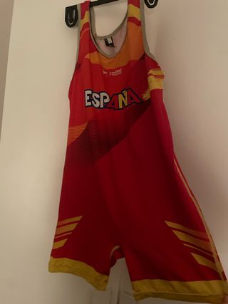 Traje de baño deportivo con diseño inspirado en España. - Colores rojo, naranja y amarillo. - Logo TORRE en la parte superior. - Inscripción ESPAÑA en grande.
