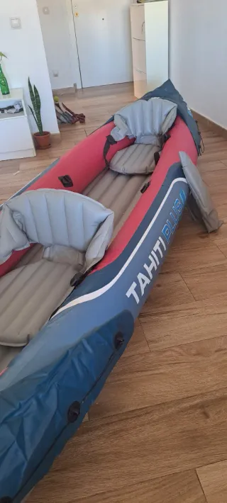 Se venden dos kayaks inflables para dos personas cada uno, con sus remos y una boya salvavidas sin estrenar. - Dos kayaks (2 individuales o uno de dos plazas, ya que viene con 2 asientos en lugar de 4, como puede parecer en la imagen). Solo se usó uno de ellos y UNA VEZ, el otro está sin usar - Incluye remos. - Incluye una boya salvavidas sin estrenar.