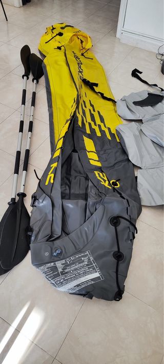 Kayak inflable INTEX Explorer K2, ideal para dos personas. Incluye remos, dos asientos y quilla. Pocos usos, muy buen estado. - Color amarillo y gris. - Material de vinilo resistente. - Incluye dos remos de aluminio. - Quilla para mayor estabilidad.
