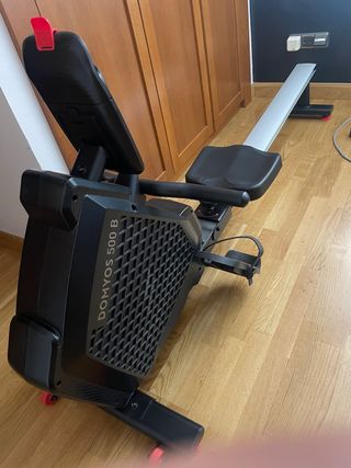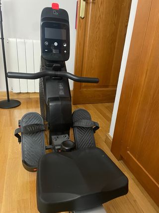 Máquina de remo DOMYOS 500 B en color negro. Ideal para entrenamientos cardiovasculares en casa. - Diseño plegable para fácil almacenamiento. - No necesita enchufe, funciona cuando la activas con el ejercicio. - Muy silenciosa. - Se conecta por Bluetooth a diversas app de actidad fisica (y funciona). - Preparada para colocar el telefono o la tablet y programar y seguir los entrenamientos. - Pantalla digital para seguimiento de métricas. - Pedales ajustables con correas. - Usado unas 10 veces. Parece nueva. Su coste actual en tienda es 450€ POR RAZONES DE PESO Y TAMAÑO NO SE ENVIA