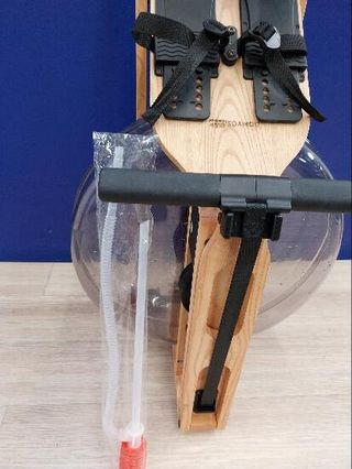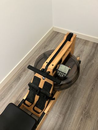 Máquina de remo con diseño de madera y depósito de agua. - Estructura principal de madera. - Depósito de agua transparente. - Pantalla digital para seguimiento de ejercicio. - Reposapiés ajustables con correas. - Manillar ergonómico.