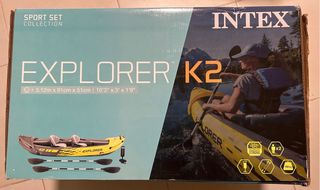 Kayak hinchable Intex Explorer K2. Usado dos veces. - Capacidad: 2 personas - Incluye 2 remos desmontables , 2 asientos hinchables, bomba de inflado y quilla de dirección extraible. - Dimensiones: 312x91x51 cm.