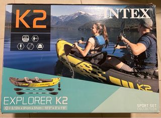 Kayak Intex Explorer K2 para dos personas, ideal para aventuras acuáticas. Incluye remos y bomba. - Modelo: Explorer K2 - Capacidad: 2 personas - Dimensiones: 3.12m x 91cm x 51cm - Incluye: 2 remos y bomba de aire - Carga máxima: 180 kg
