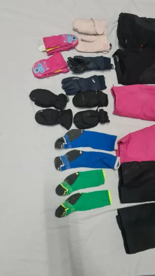 Equipacion de esquí para niño@ en buen estado.regalo calcetines y guantes-manoplas.para 6-9años. - Color negro y rosa. - Cierre con cremallera y velcro. - Detalle de rayas reflectantes en la parte inferior.