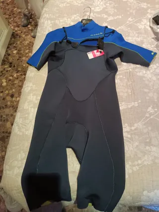 Neopreno corto para mujer, ideal para deportes acuáticos. - Color azul y negro. - Cremallera frontal. - Mangas cortas.