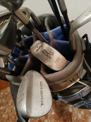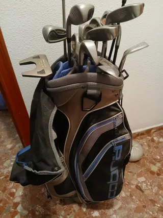 Bolsa de golf marca Cobra con varios palos. - Diseño en negro, gris y azul. - Múltiples compartimentos y bolsillos. - Incluye un putter. - Cremalleras en buen estado.