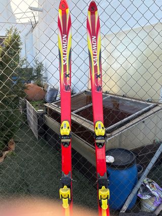 Esquís de la marca Salomon, modelo SX, con fijaciones. - Color rojo y amarillo. - Diseño deportivo.