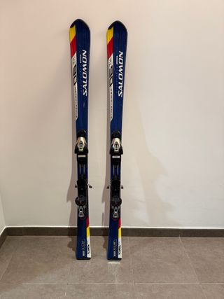 Esquís Salomon Streetracer 06 de 148cm en color azul con detalles en rojo y amarillo. Perfectos para disfrutar de la nieve. - Marca: Salomon - Modelo: Streetracer 06 - Cotas: 116 /66 / 101 - Radio Giro: 10.7 - Diseño: Azul con detalles rojos y amarillos