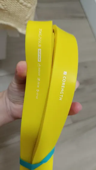 Banda elástica de resistencia de color amarillo. - Resistencia de 25 kg / 55 lb. - Marca: CORENGTH by Decathlon. - Fabricada en látex.