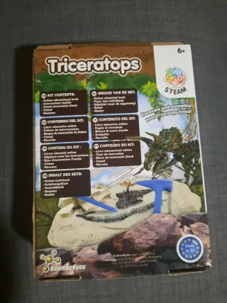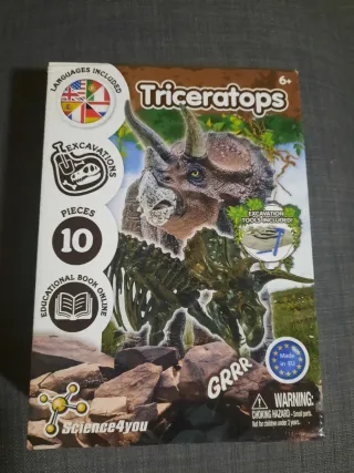 Kit de excavación de dinosaurios Triceratops de Science4you. Incluye todo lo necesario para la diversión y el aprendizaje. - Contiene 10 piezas. - Incluye herramientas de excavación. - Acceso a libro educativo online. - Edad recomendada: 6+ años. - Fabricado en la UE.