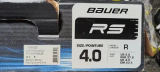 Patines de hockey en línea Bauer RS para junior. - Talla 4.0 (US 5.0, EUR 37.5, UK 4.5, CM 23.5). - Color: Negro y blanco. - Fabricados en China.