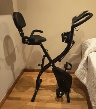 Bicicleta elíptica de color negro, ideal para entrenamientos en casa. Cuenta con un diseño moderno y funcional. - Pedales amplios y antideslizantes. - Manillar ergonómico. - Soporte para botella.