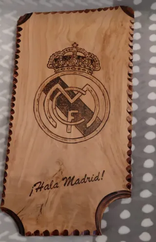 Tabla decorativa de madera con el escudo del Real Madrid y la frase ¡Hala Madrid!. - Diseño grabado a fuego. - Bordes decorados con puntadas. - Ideal para aficionados del club.