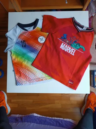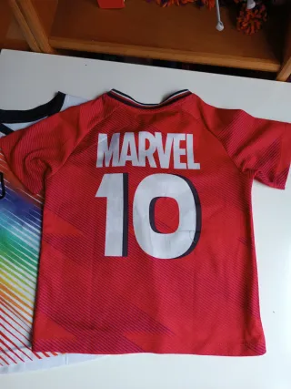 Dos camisetas, una de temática Marvel y otra de fútbol, ideales para niños de 2 a 4 años. - Camiseta de fútbol con diseño arcoíris y número 10. - Camiseta roja con personajes de Marvel (Spider-Man, Hulk, Iron Man, Capitán América). - Ambas con cuello redondo.
