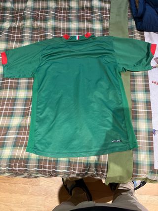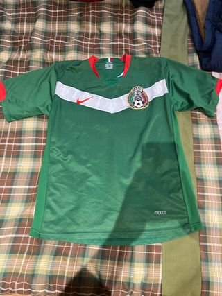 Camiseta de fútbol retro de México. - Color verde. - Diseño con banda blanca y detalles rojos. - Logo de Nike y escudo de México.