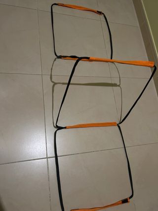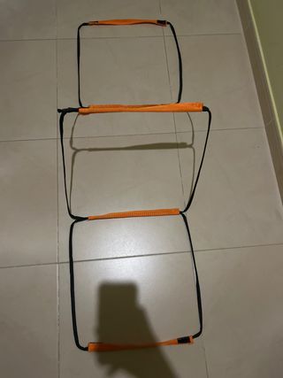 Escalera de entrenamiento para mejorar la agilidad y la coordinación. - Barras de color naranja. - Cintas negras de sujeción. -Tien una bolsa pa guardar