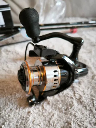 Carrete de pesca con un diseño moderno y funcional. Para pesca de chipirones y calamares. - Cuerpo principal en color negro. - Bobina con detalles en color naranja. - Mango ergonómico para un agarre cómodo.