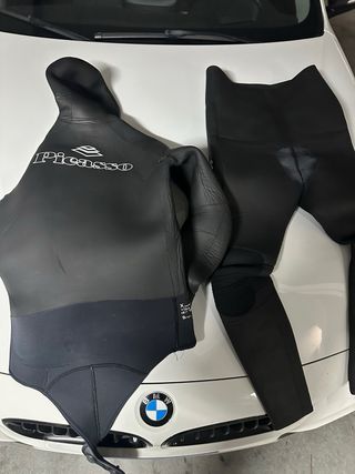 Traje de neopreno liso de la marca Polo Sub - Material de neopreno liso, tipo sandwich (mucho más resistente que un traje normal) - Pisete en el pantalón, pedido ya de fábrica. - Refuerzo de carga interno. - Cierre de chaqueta con velcro. - Todas las uniones y terminaciones de mangas, capucha, cintura y piernas están rematadas y reforzadas con costuras. El traje fue hecho a medida para una persona de 1,82 m y unos 115-120 kilos de peso. Más o menos estaría entre una talla 6 y una talla 7 convencional, dependiendo la marca. El traje nuevo rozó los 500 euros. Se vende por cambio de talla. Se ha utilizado en menos de 10 ocasiones.