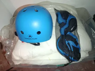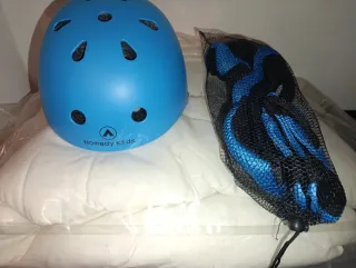 Conjunto de protecciones para niños de la marca Nomady Kids. - Casco de color azul. - Rodilleras y coderas incluidas. - Diseño para actividades deportivas.