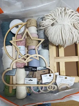 Kit completo para manualidades de macramé, ideal para crear tus propios proyectos. - Varios tipos de cordones de algodón en diferentes colores. - Aros de madera de diferentes tamaños. - Adornos de madera con formas de nube,estrella y luna. - Herramientas para macramé. - Cierres y anillas metálicas. Mosquetones -Bastidor -Espejo -2 bases con pinza para trabajar comodamente 30 artículos comprados en página especializada macramé. -Alta calidad Valorado en más de 130€