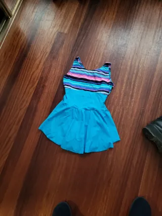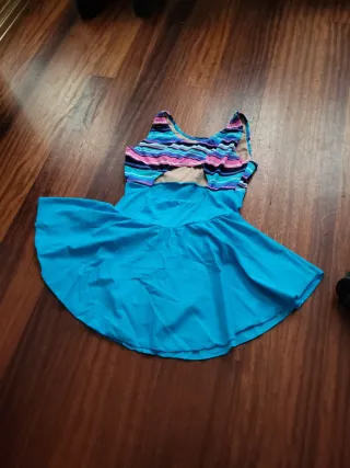 Mallot de patinaje artístico con un diseño vibrante. Talla niño / niña. Elástico. Ancho sisa: 36cm. Cintura: 30cm. Largo: 60cm. - Parte superior a rayas multicolores (rosa, azul, morado, negro). - Falda integrada de color azul. - Tirantes anchos.