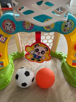 Juego infantil 2 en 1 para practicar fútbol y baloncesto. Incluye una portería y una canasta. - Diseño colorido con animales. - Pelota de fútbol incluida. - Pelota de baloncesto incluida.