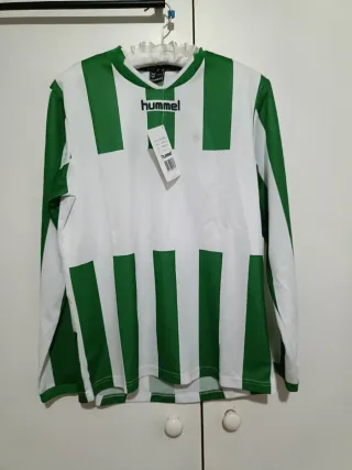 Camiseta deportiva de manga larga con diseño a rayas verdes y blancas. - Marca: Hummel - Talla: L - Diseño a rayas verticales - Cuello redondo