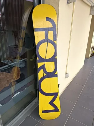 Tabla de snowboard Forum Pro modelo Eddie Wall, tamaño 156 cm. Diseño llamativo con franjas amarillas y grises. - Modelo: Eddie Wall - Tamaño: 156 cm - Diseño: Franjas amarillas y grises con detalles verdes y un conejo. "Solo tabla"