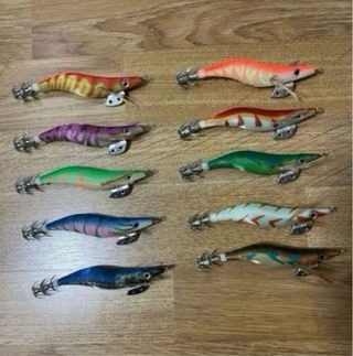 Lote de 10 señuelos de calamar, ideales para pesca nocturna o en aguas profundas. Cada señuelo tiene un diseño llamativo y colores vibrantes que atraen a los peces. - Diseños variados en cada señuelo. - Materiales resistentes para mayor durabilidad. - Aptos para diferentes técnicas de pesca.