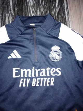 Sudadera del Real Madrid - Color azul marino. - Mangas blancas con detalles. - Logo de Adidas y escudo del Real Madrid.