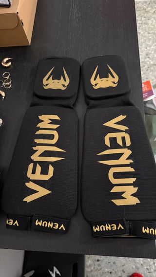 Par de espinilleras Venum de calcetin con velcro en la parte superior en color negro con detalles dorados. Talla M TOTALMENTE NUEVAS A ESTRENAR