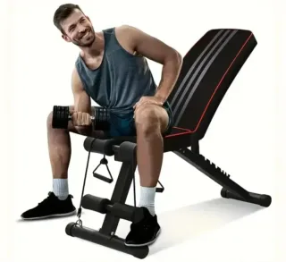 Banco de pesas versátil para entrenamientos en casa. Su diseño permite ajustar el respaldo para diferentes ejercicios. - Estructura metálica robusta. - Tapicería acolchada en negro y rojo. - Plegable para fácil almacenamiento.