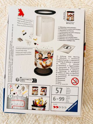 Puzzle 3D de Ravensburger con licencia oficial de la EM 2024. Permite crear un práctico y divertido portalápices. - Diseño con jugadores de la selección alemana. - Tecnología EasyClick para un montaje sin pegamento. - Dimensiones aproximadas: 9,5 cm de alto.