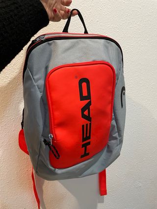 Mochila de la marca Head con un diseño moderno y funcional. - Color gris con detalles en rojo. - Compartimento frontal con cremallera. - Logo de la marca visible.