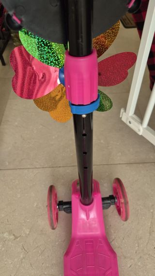 Patinete de 3 ruedas con altura del manillar regulable. En rosa. Con ruedas con luces led. Marca Scooter. Tubo de alumnio y freno trasero. Con cesto de mariquita. En muy buen estado. Solo hay una luz de una de las ruedas que no se enciende a veces. De 2 a 7 años.