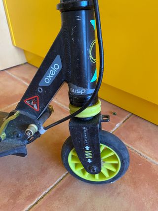 Patinete infantil de la marca OXELO. - Color negro y detalles en amarillo. - Ruedas de color amarillo. - Plataforma para los pies. - Freno delantero y trasero.