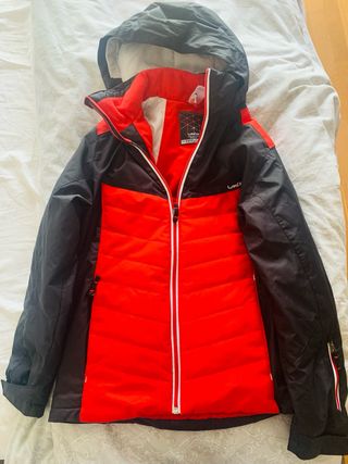 Chaqueta de nieve para junior de la marca Wedze, ideal para actividades al aire libre. - Diseño bicolor en negro y rojo. - Capucha integrada. - Cremallera frontal. - Bolsillos laterales.