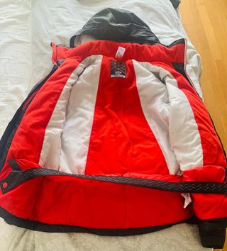 Corta vientos negro para esquiar o actividades al aire libre. Usada una sola vez. - Diseño ergonómico. - Logo rojo. - Material térmico.