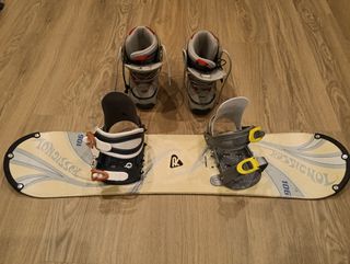 Conjunto de tabla de snowboard Rossignol con fijaciones y botas. - Tabla de snowboard Rossignol. - Fijaciones incluidas. - Botas de snowboard.