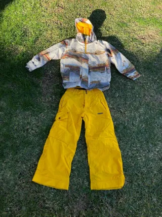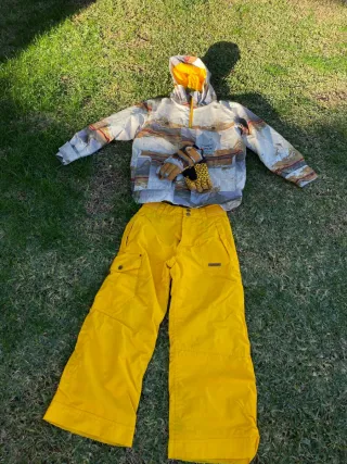 Conjunto de esquí para niños, ideal para disfrutar de la nieve. Incluye chaqueta, pantalón y guantes. - Chaqueta con estampado de paisajes y forro interior amarillo. - Pantalón de color amarillo brillante con bolsillos laterales. Tiene el bajo algo desgastado por el roce. Añado foto. - Guantes a juego.