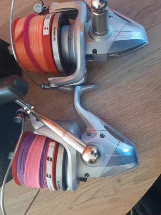 Dos carretes de pesca Shimano Ultegra XSB. - Color plateado y gris. - Bobinas con hilo de pesca de colores (naranja, rosa, morado). - Marca Shimano. En perfecto estado. 2 bobinas originales y 4 de teflon Precio por cada uno.