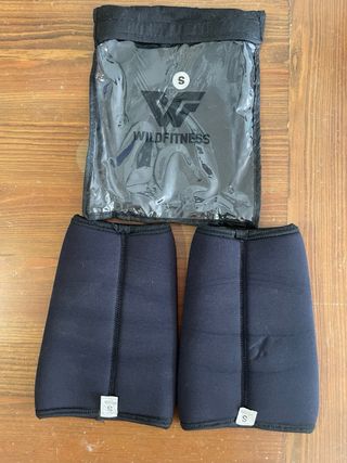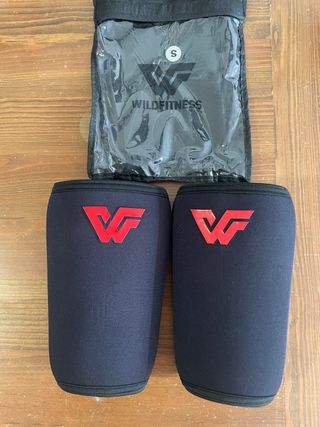 Par de rodilleras de la marca Wildfitness, diseñadas para ofrecer soporte. - Color negro. - Logo de la marca en rojo. - Talla S. - Incluye bolsa de transporte.
