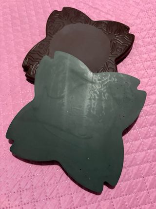 Dos rodilleras diseñadas para yoga/ pád. Son de color marrón oscuro y tienen un diseño grabado en el borde.Sin estrenar - Material: Chocolate. - Diseño: Forma de flor con borde decorado.