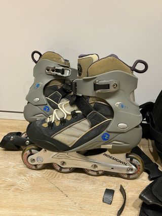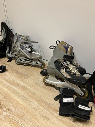 Se venden patines en línea, un par de la marca Rossignol en talla 41 y otro par de la marca Rollerblade en talla 40. Incluyen protecciones. - Patines Rossignol talla 41. - Patines Rollerblade talla 40. - Incluye muñequeras y rodilleras. - y la bolsa de transporte. A 30€ cada par. Los dos por 50€.